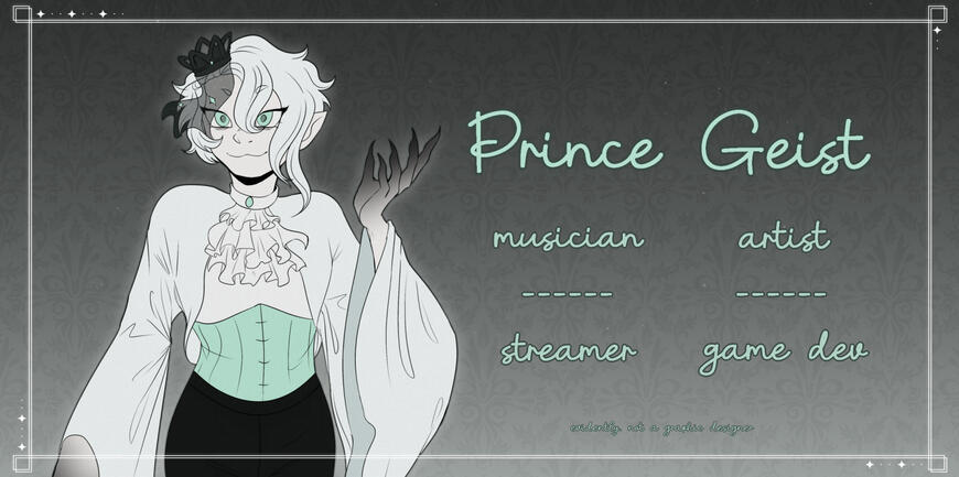 Here lies Prince Geist...Kidding!Back from the dead and here to entertain is none other than me - Prince Geist!In my afterlife, I'm known to make music, art, games, and even stream!So here lies not me, but the information regarding how I spend my afterlife!And, if you're so inclined, information on how to purchase my services - from music to art!Don't hesitate - I'm just a summoning away!